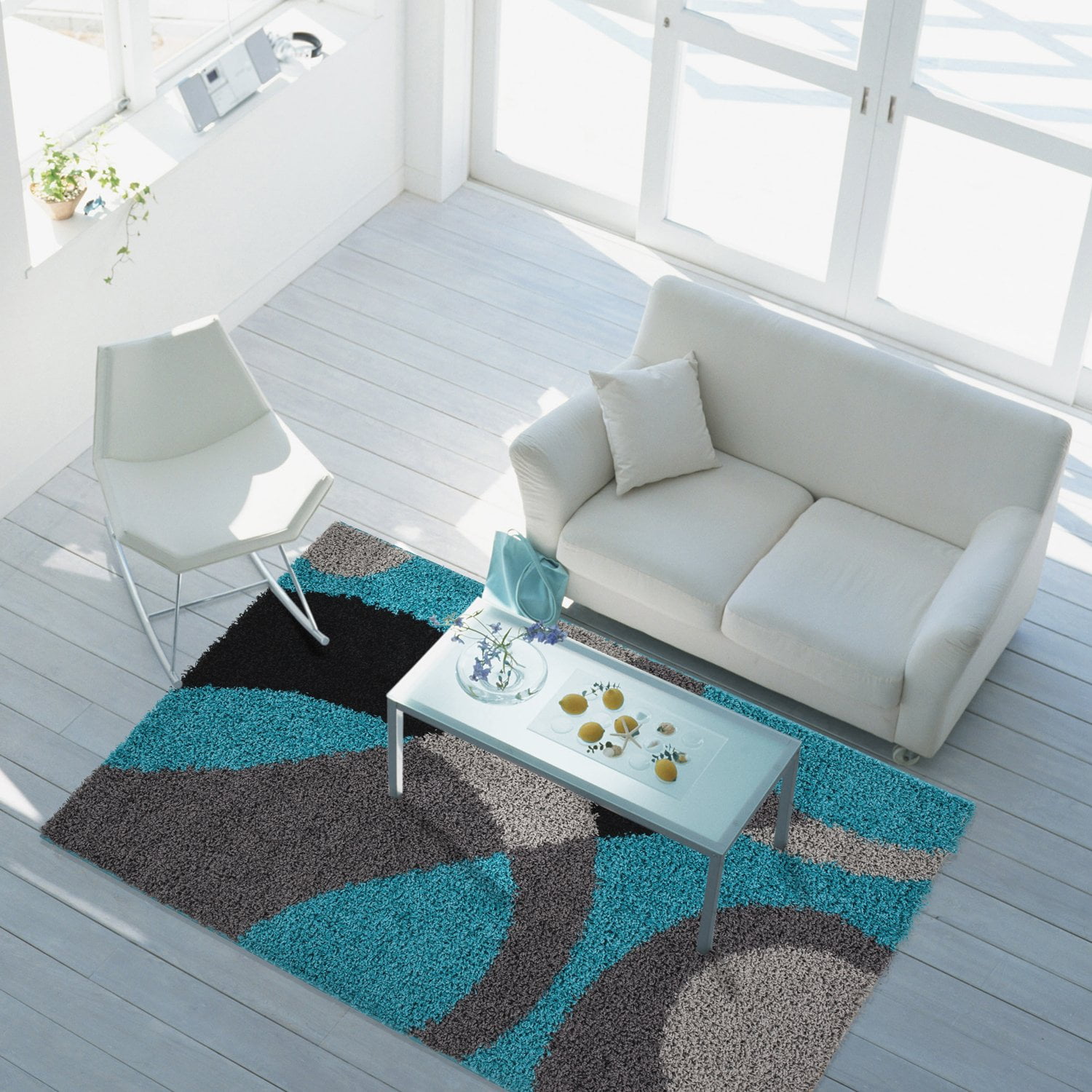 Ladole Rugs Grey Turquoise Indoor Solid Plain Shag Soft ... from i5.walmartimages.com Whether rolled out at the center of your living room, underneath your dining table, or in your master suite, area rugs act as both a foundation and a focal point. Add a sense of texture to a modern living room with this attractive shag rug or create a classy focal. Make sure that there is enough rug extending out behind the furniture pieces so you can comfortably walk behind them (and you're not walking one foot on the rug and one.